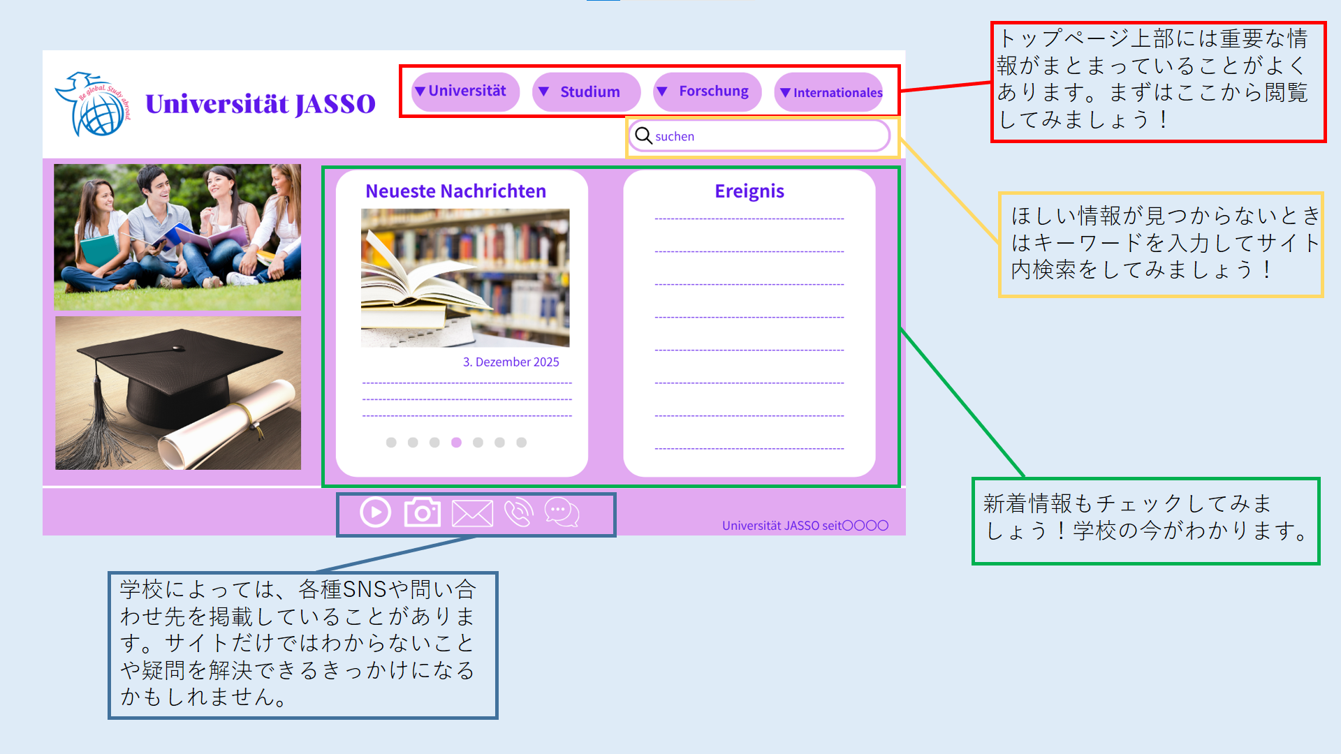 ⽇本の大学のウェブサイトにどのようなことが掲載されているかを考えながら⾒てみると、ドイツ語で書かれていても理解しやすくなるでしょう。